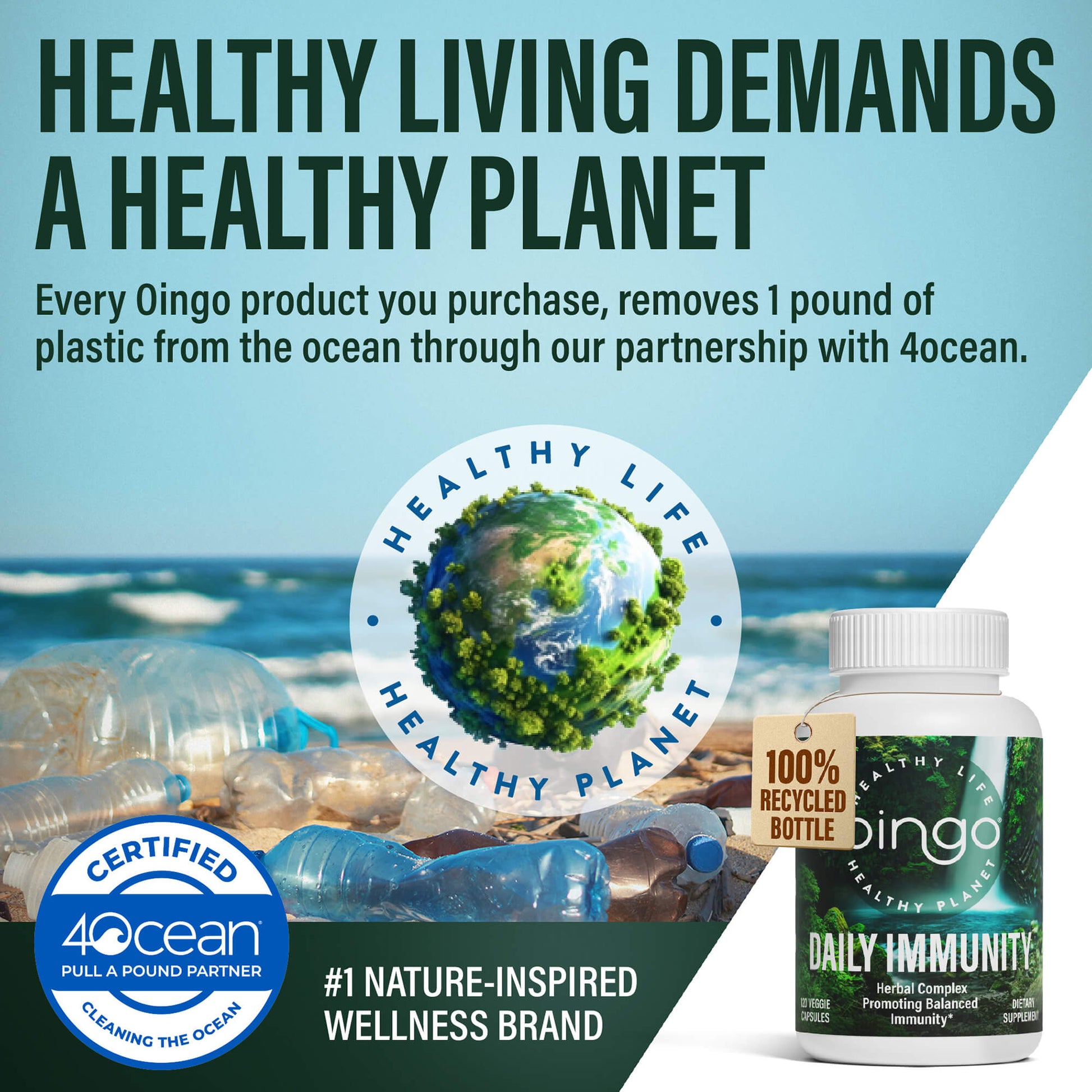 Wellness isn’t just about people—it’s about the planet too. Oingo supplements are packaged in 100% post-consumer recycled (PCR) bottles and proudly feature the 4ocean logo, supporting ocean cleanup efforts worldwide. Choosing Oingo means choosing health that’s cleaner for you and cleaner for the Earth.
